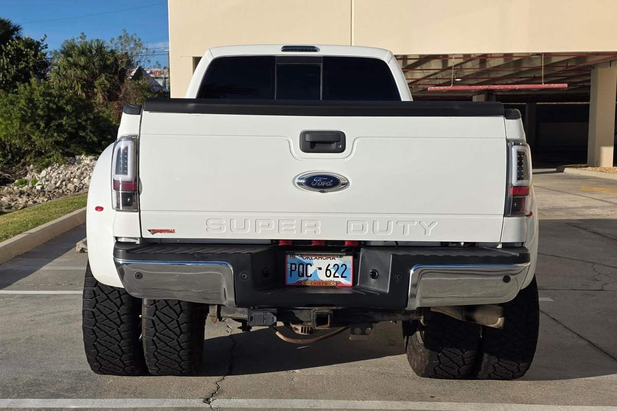 According to the digital window sticker provided in the gallery, this F-350 Super Duty is a Lariat 4×4 model, and notable factory equipment includes the Lariat Interior, FX4 Off-Road, and 14,000 GVWR packages, a 3.73 ratio electronic locking axle, roof clearance lights, heated and cooled front seats, and a navigation system.