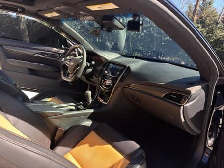 THIS… is a 2016 Cadillac ATS-V Coupe, finished in Black Raven with a black and Saffron interior.
