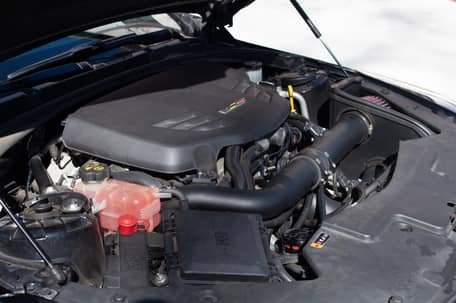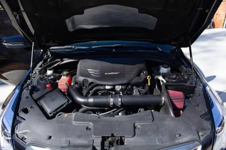 - Power comes from a 3.6-liter twin-turbocharged V6, rated at 464 horsepower and 445 lb-ft of torque in stock form. Due to the modifications performed to this ATS-V, it may produce more power, but a dyno sheet was not provided to confirm. Output is sent to the rear wheels via a 6-speed manual transmission.