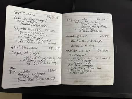 - November 2024 (61,919 miles): Engine oil and filter changed, transmission fluid, differential fluid, and brake fluid replaced