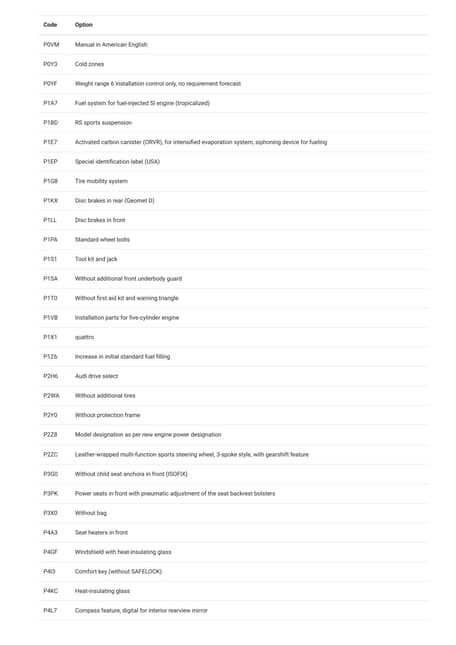 - Black Optic Package (20-inch 7-spoke design high-gloss anthracite forged wheels, high-gloss black exterior mirror housings, black Audi rings and badges)
