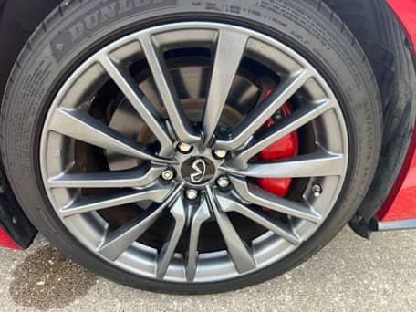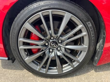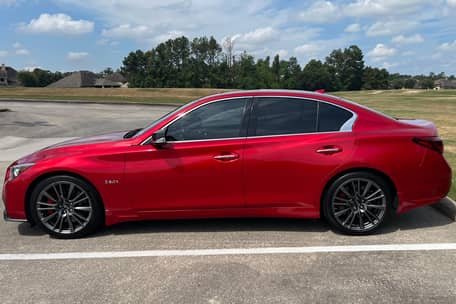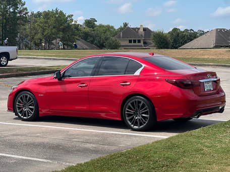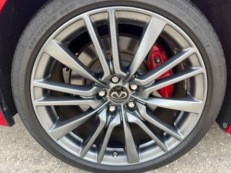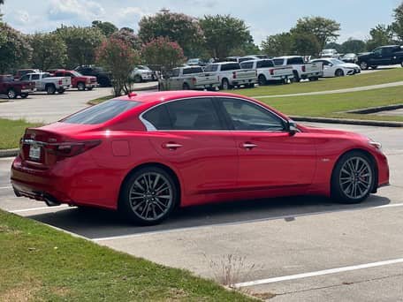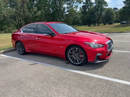 THIS… is a 2020 Infiniti Q50 Red Sport 400, finished in Dynamic Sunstone Red with a Graphite interior.