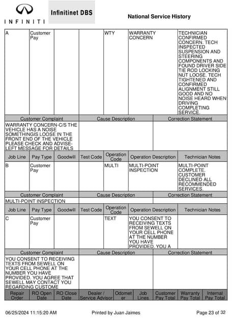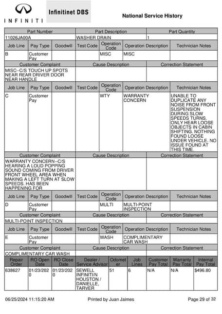- January 2023 (50,310 miles): Front passenger’s door lock replaced
