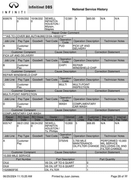 - August 2020 (10,000 miles): Engine oil and filter changed