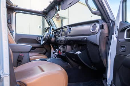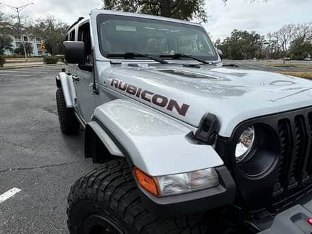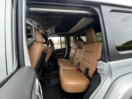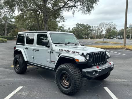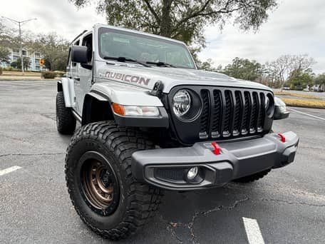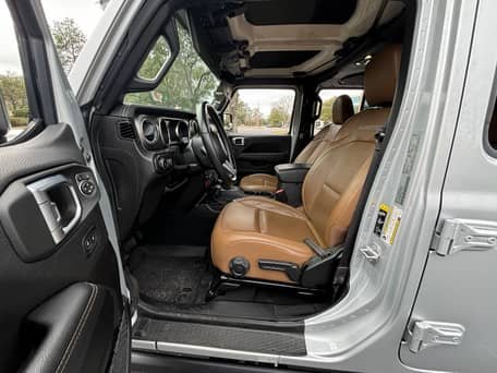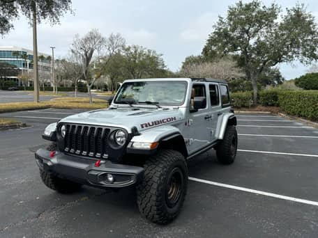 THIS… is a 2022 Jeep Wrangler Unlimited Rubicon 4×4, finished in Silver Zynith with a black and Dark Saddle interior.