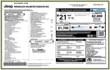 - According to the digital window sticker provided in the gallery, this Jeep Wrangler is an Unlimited Rubicon 4×4 model, and notable factory equipment includes the Xtreme Recon 35-inch Tire Package, the Trailer-Tow and Heavy-Duty Electrical Group, Tru-Lok front and rear axles, and leather upholstery.