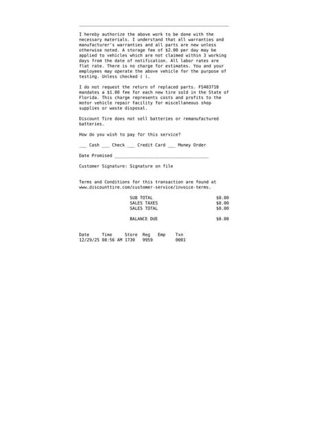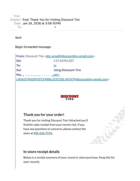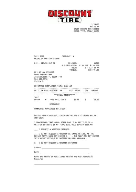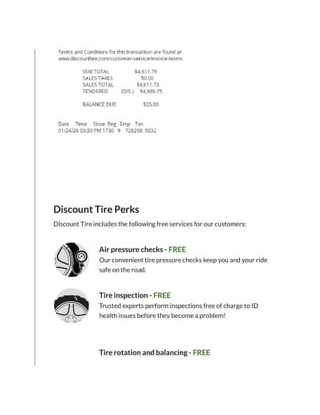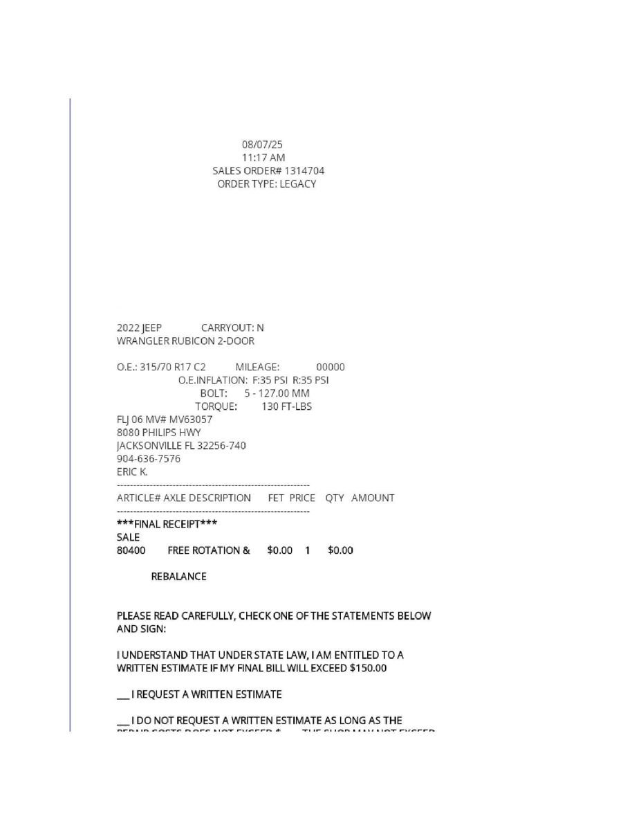 - August 2025: One tire replaced, tires rotated
