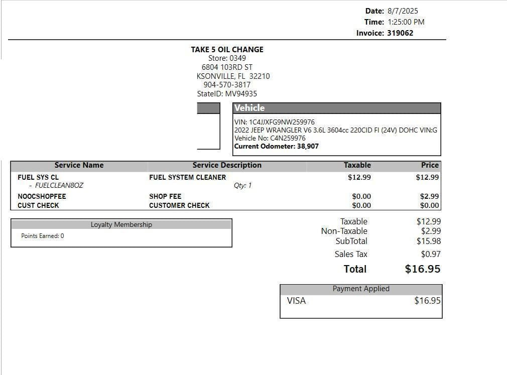 - August 2025 (38,907 miles): Fuel system cleaner applied
